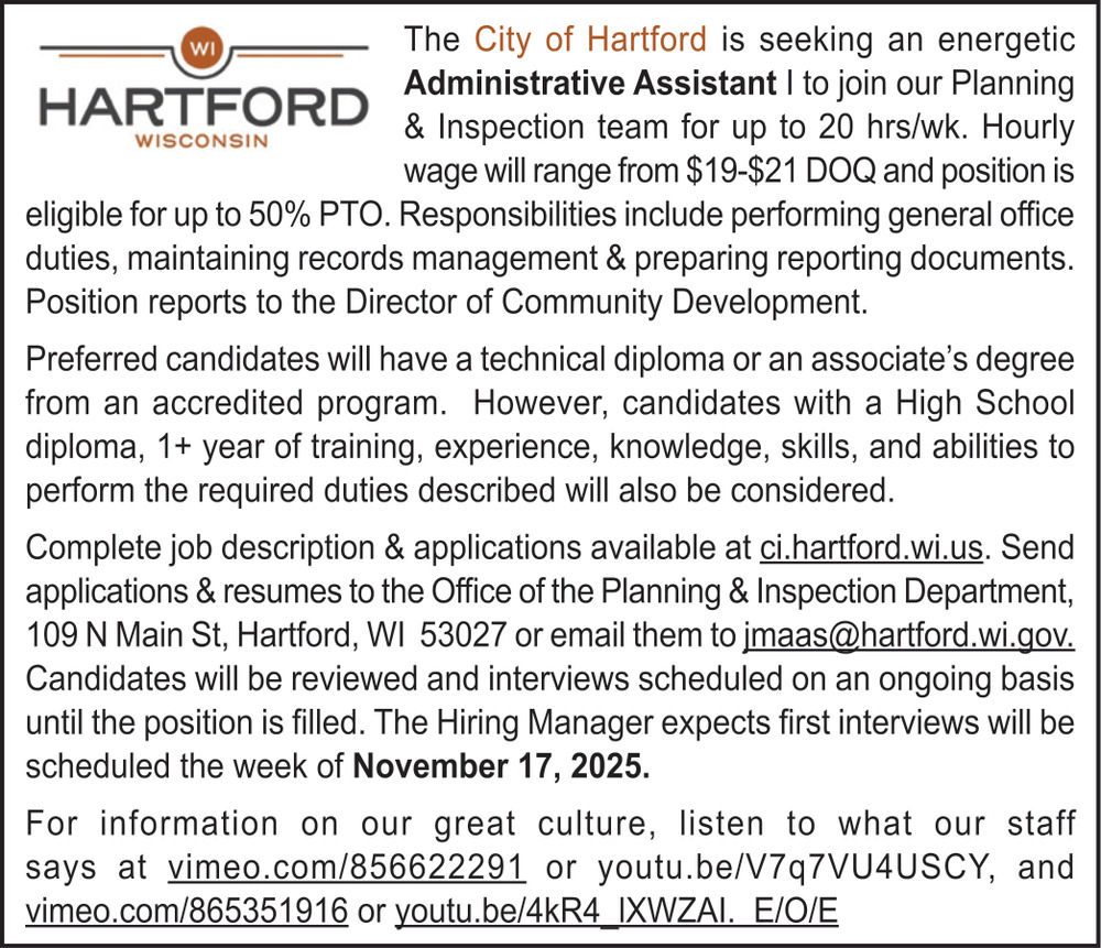 Oct 31, 2025. City of Hartford Administration Jobs from Southeast Wisconsin Jobs